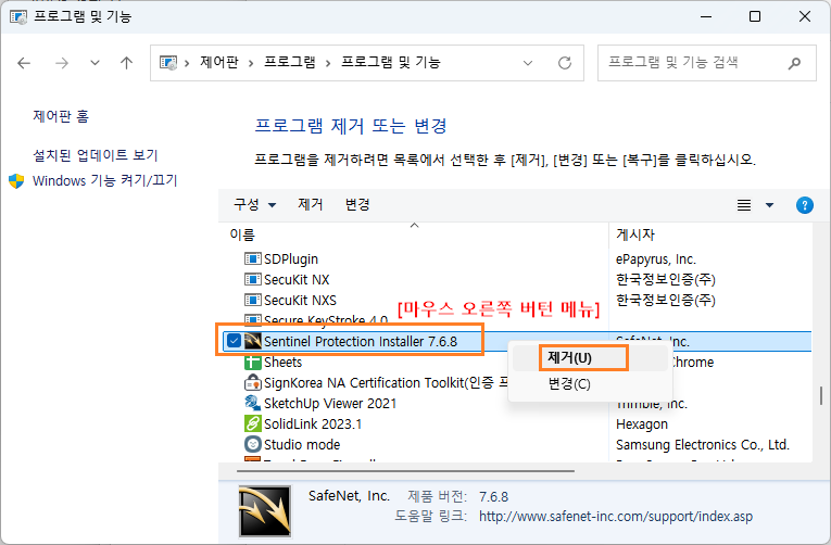 1-1) "제어판"->"프로그램 및 기능"에에서 기존 설치된 USB락 드라이버(Sentinel Protection Installer...)가 있으면 먼저 제거합니다.